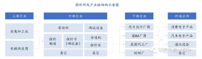 探針作為半導(dǎo)體產(chǎn)品測試的關(guān)鍵部件,處于半導(dǎo)體產(chǎn)業(yè)鏈中游的測試設(shè)備及其零部件制造行業(yè),探針行業(yè)的上游為金屬加工,電鍍行業(yè),下游為芯片設(shè)計(jì)、晶圓制造及晶圓代工、封裝與測試行業(yè),經(jīng)測試達(dá)到設(shè)計(jì)規(guī)范要求的半導(dǎo)體產(chǎn)品最終應(yīng)用與消費(fèi)電子、汽車電子、通訊設(shè)備等眾多領(lǐng)域。