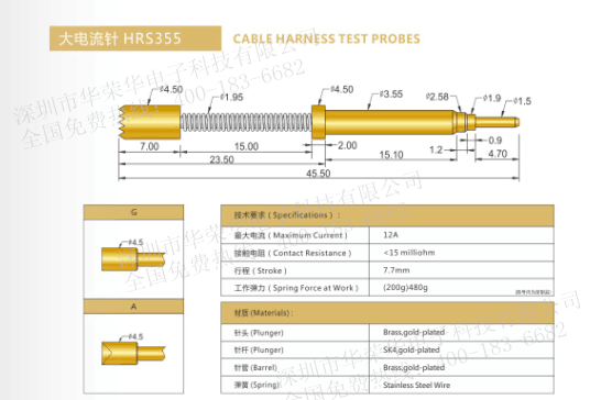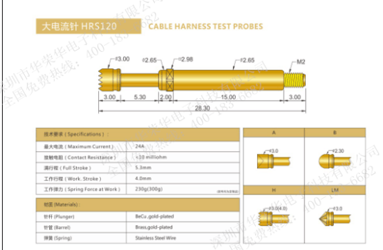 為了確保大電流的安全傳輸,大電流探針的針頭分為兩段。行程移動(dòng)期間。兩段針頭在徑方向彼此分開。因此,針頭段壓在針管上,降低轉(zhuǎn)移電阻。通過該原理,在較少發(fā)熱的同時(shí)傳輸較高的電流。大電流針額定電流有20A-100A.常用的電流針有: