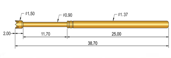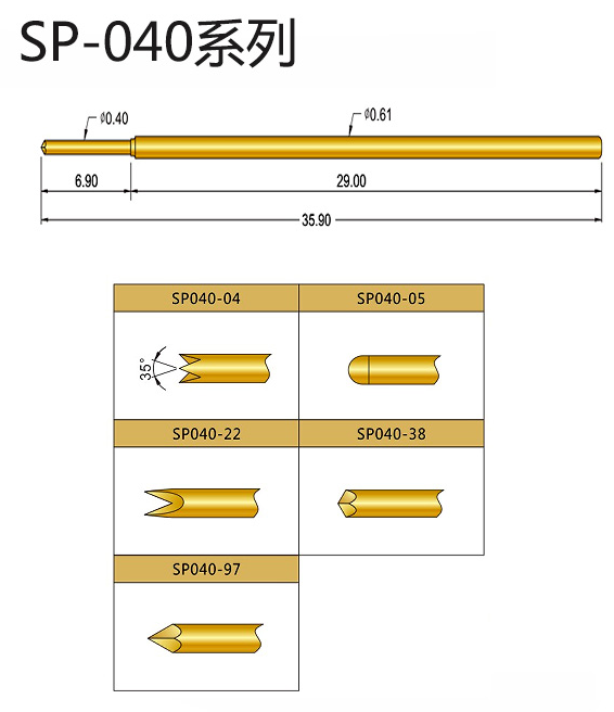 1、SP040探針的針身直徑是0.61mm,總長(zhǎng):35.90mm,頭部直徑0.40mm,額定電流:2A,接觸電阻:30毫歐姆,接觸彈力是80gf,適用于多種測(cè)試環(huán)境。