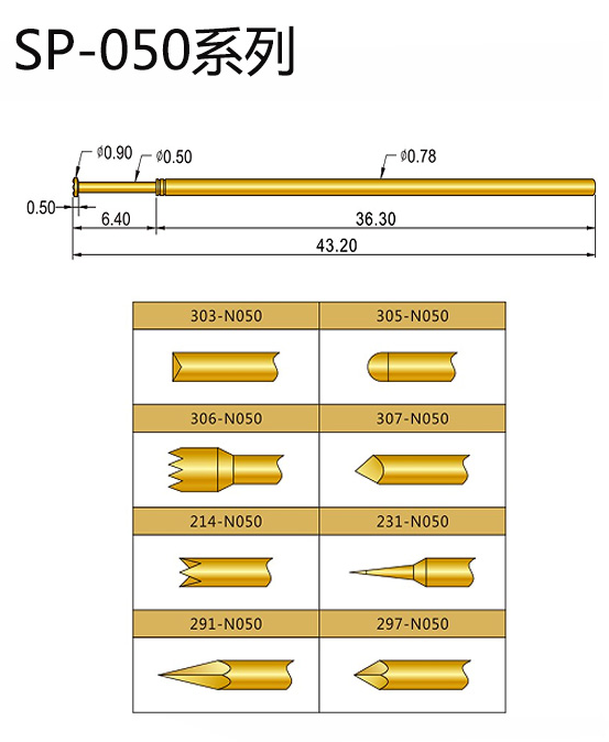 2、SP050探針的針身直徑:0.78mm,總長(zhǎng):43.2mm,有多種頭型,例如:梅花頭、凹頭、尖頭、平頭等,額定電流:3A,接觸電阻:30毫歐姆,彈力分別有1N/2N/3N,使用于在線領(lǐng)域測(cè)試。