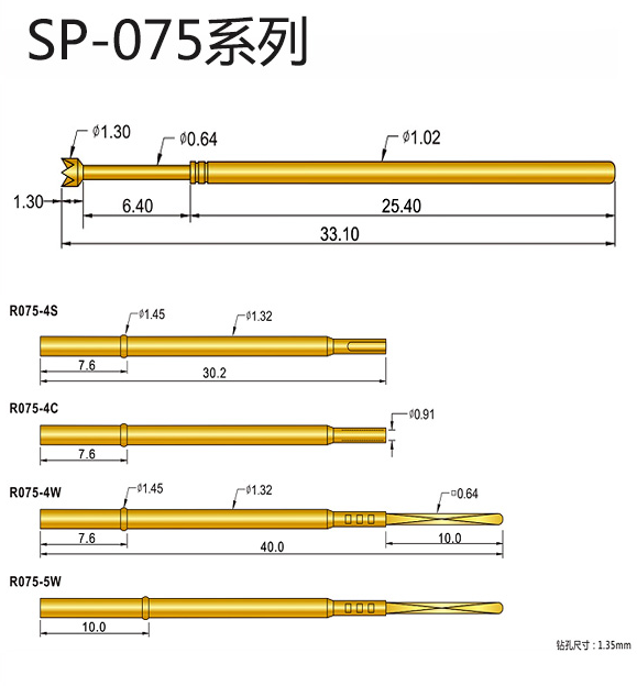 3、SP075探針的針身直徑:1.02mm,總長(zhǎng):33.10mm,額定電流:3安培,接觸電阻:30毫歐姆,彈力分別有1N/2N/3N,主要用于插件后的在線測(cè)試。