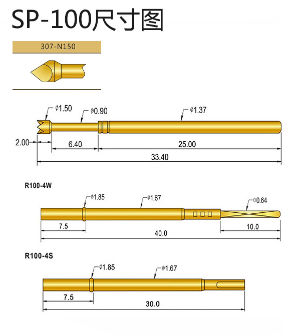 4、SP100探針直徑:1.37mm,總長(zhǎng):33.40mm,常用的配套有R100-4W以及R100-4S,接觸電阻:30毫歐姆。