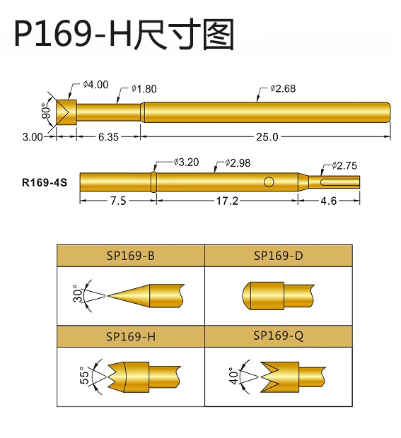 8、SP169測(cè)試探針的直徑:2.68mm,總長(zhǎng):34.35mm,頭部直徑:4.0mm,額定電流:5A,接觸電阻:50毫歐姆,建議鉆孔尺寸:3.0mm。