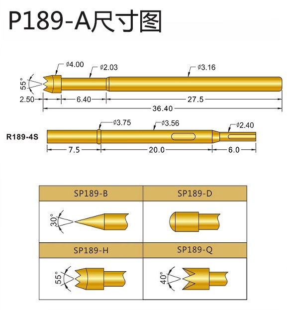 9、SP189系列探針直徑:3.16mm,總長(zhǎng):36.40mm,針頭直徑:4.0mm,常用的配套是R189-4S,建議鉆孔尺寸:3.6mm。
