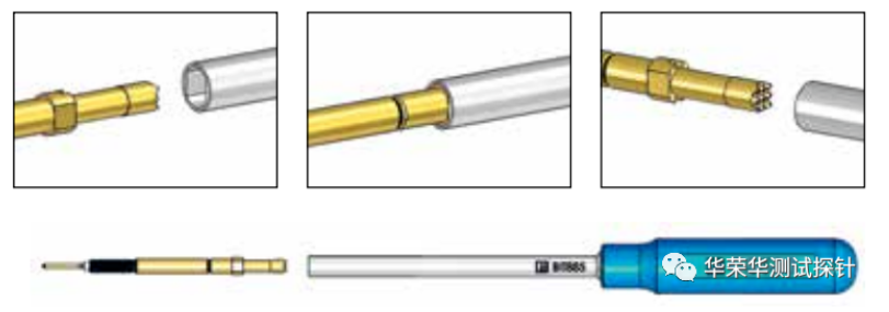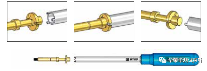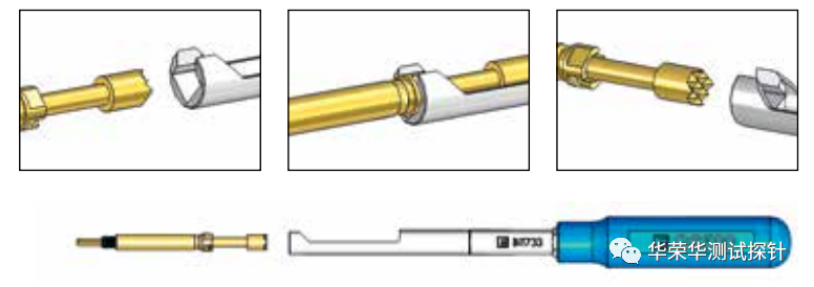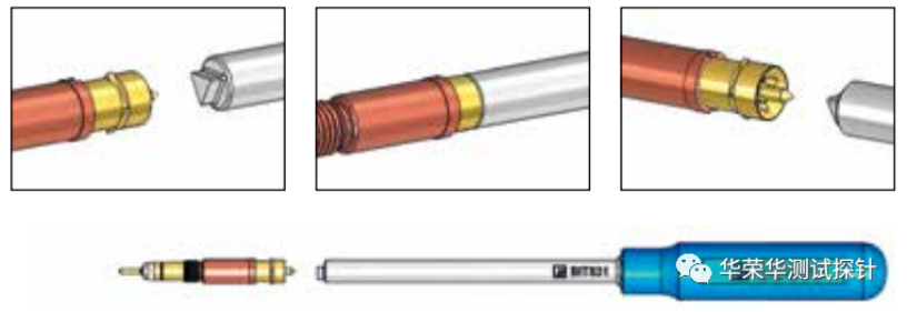 為了方便安裝和更換探針和針套,華榮華提供各種各樣的工具。安裝標準探針需要 實用的插入或旋入工具,對于安裝可調節(jié)開關觸點的開關式探針,則需要一把簡單高效的工具,另外,彈力測試儀可用于點檢模塊內探針彈力情況。