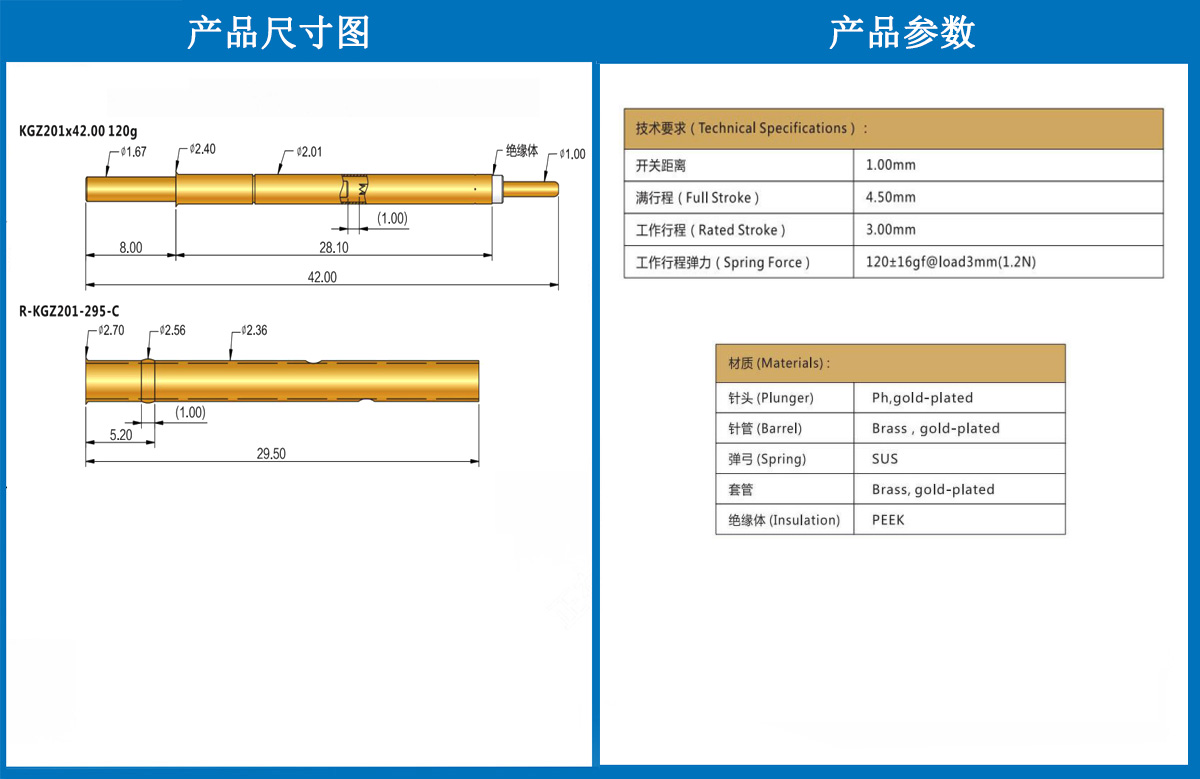 產品簡介:KGZ201探針,2.01mm測試針、總長42mm、彈簧針、測試針