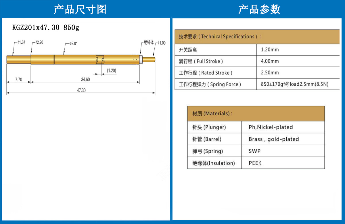 產(chǎn)品簡介:KGZ201探針,2.01mm測試針、總長47.30mm、彈簧針、測試針