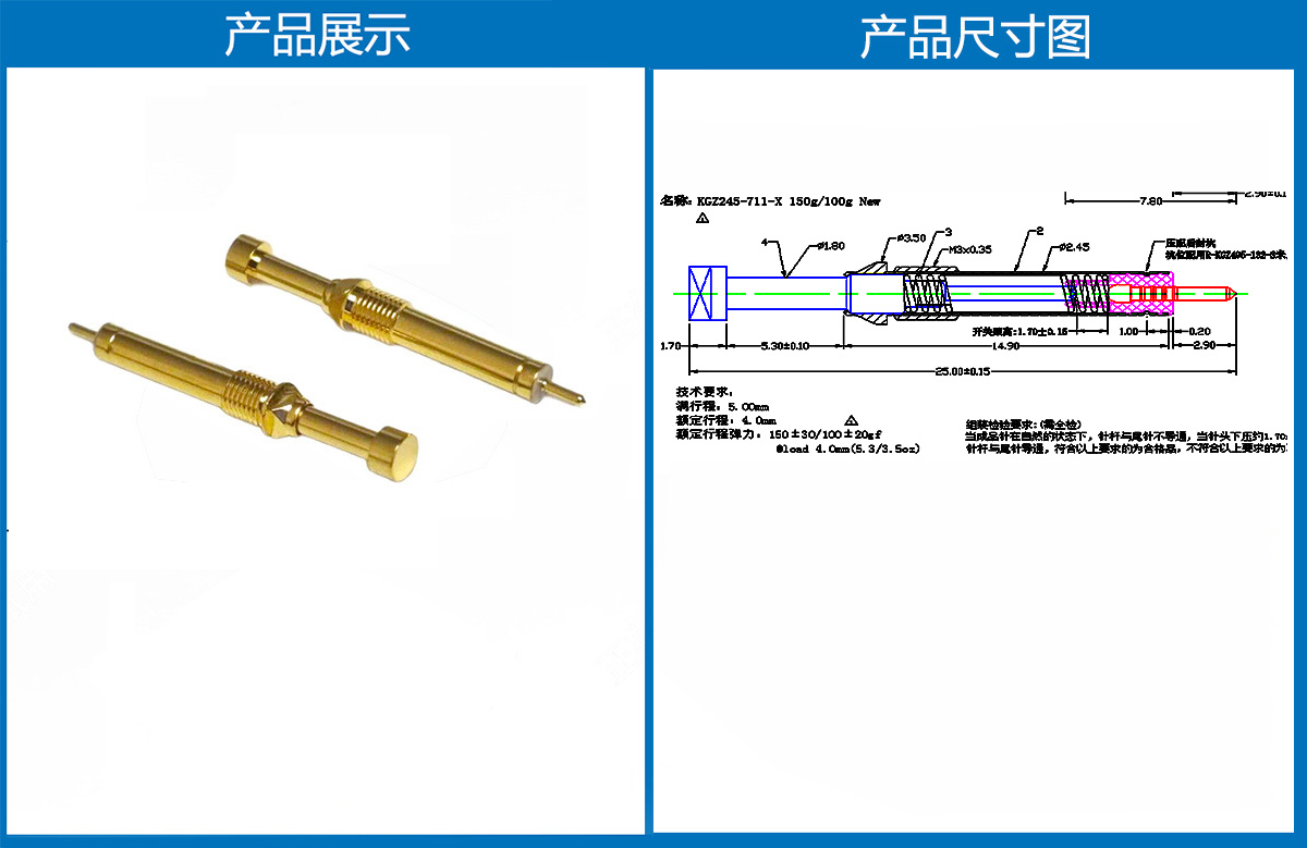 產(chǎn)品介紹:本產(chǎn)品一般用有定向作用的結(jié)束測(cè)試用,產(chǎn)品選用日本SK4 彈簧選用的是琴鋼線。工廠選用的材質(zhì)都是比較硬的,有利于在測(cè)試的時(shí)候過(guò)大電流不會(huì)容易損壞。