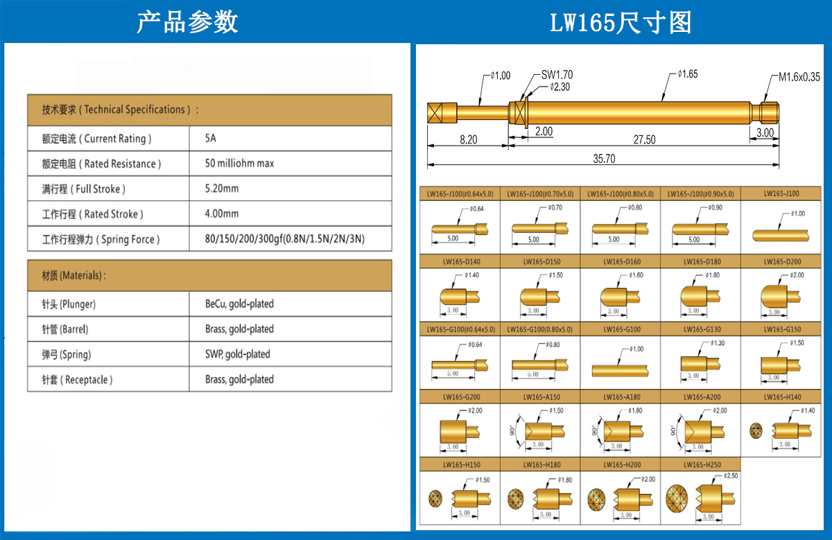產(chǎn)品介紹:本產(chǎn)品一般用有定向作用的結(jié)束測試用,產(chǎn)品選用日本SK4 彈簧選用的是琴鋼線。工廠選用的材質(zhì)都是比較硬的,有利于在測試的時候過大電流不會容易損壞。