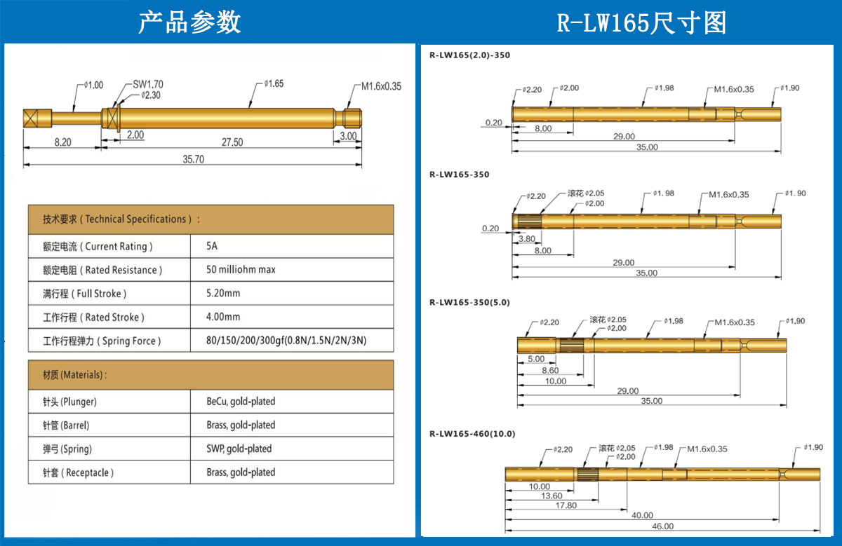 產(chǎn)品簡介:R-LW165線束針套,1.98mm測試針套、總長35mm、彈簧針